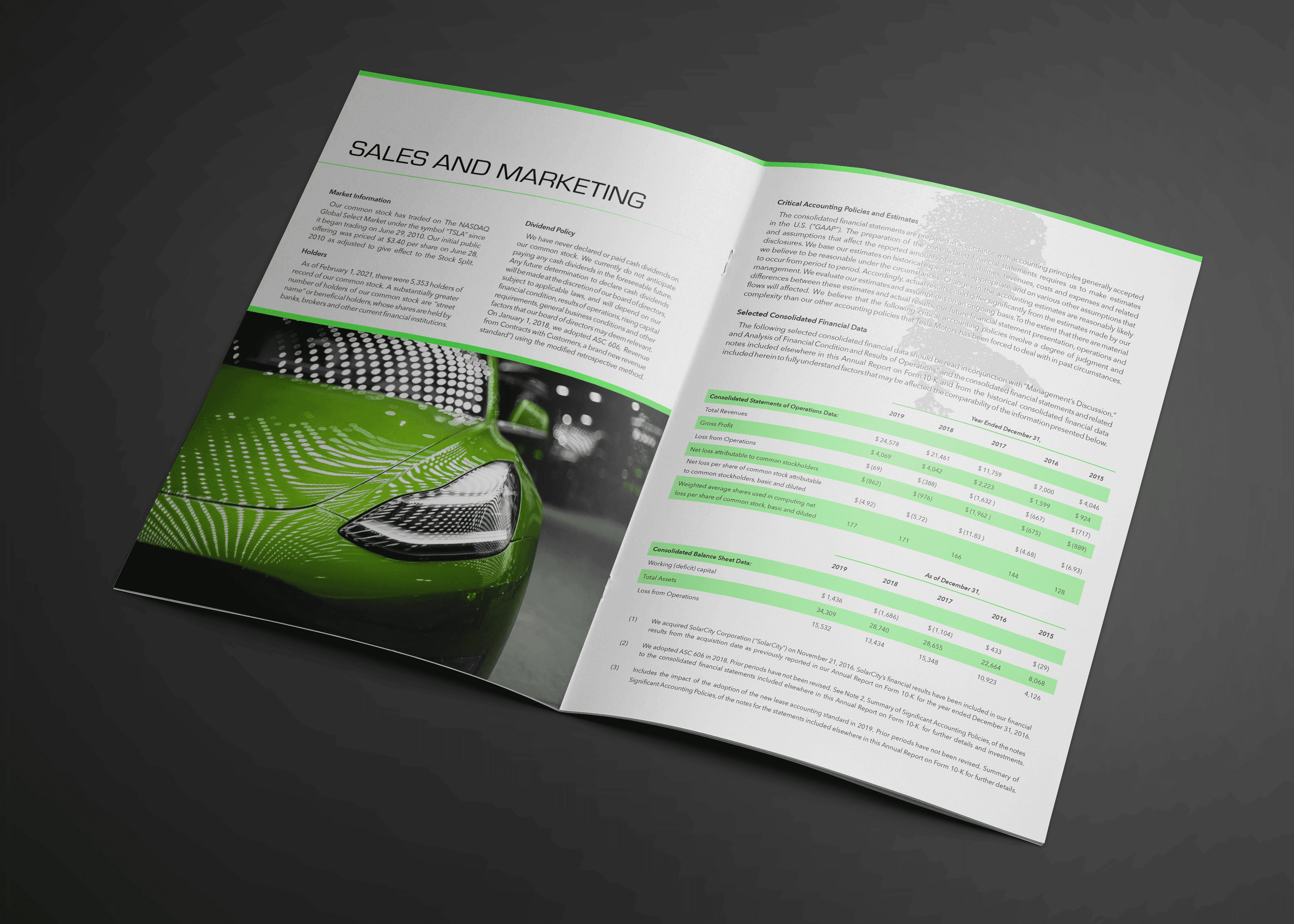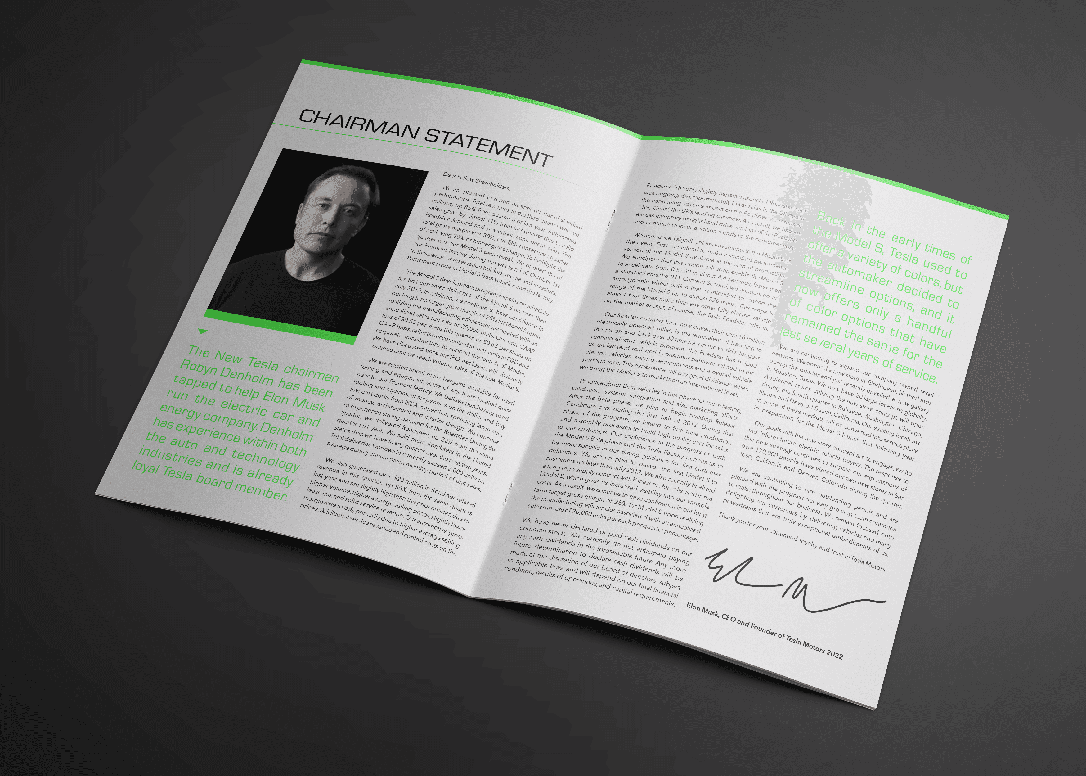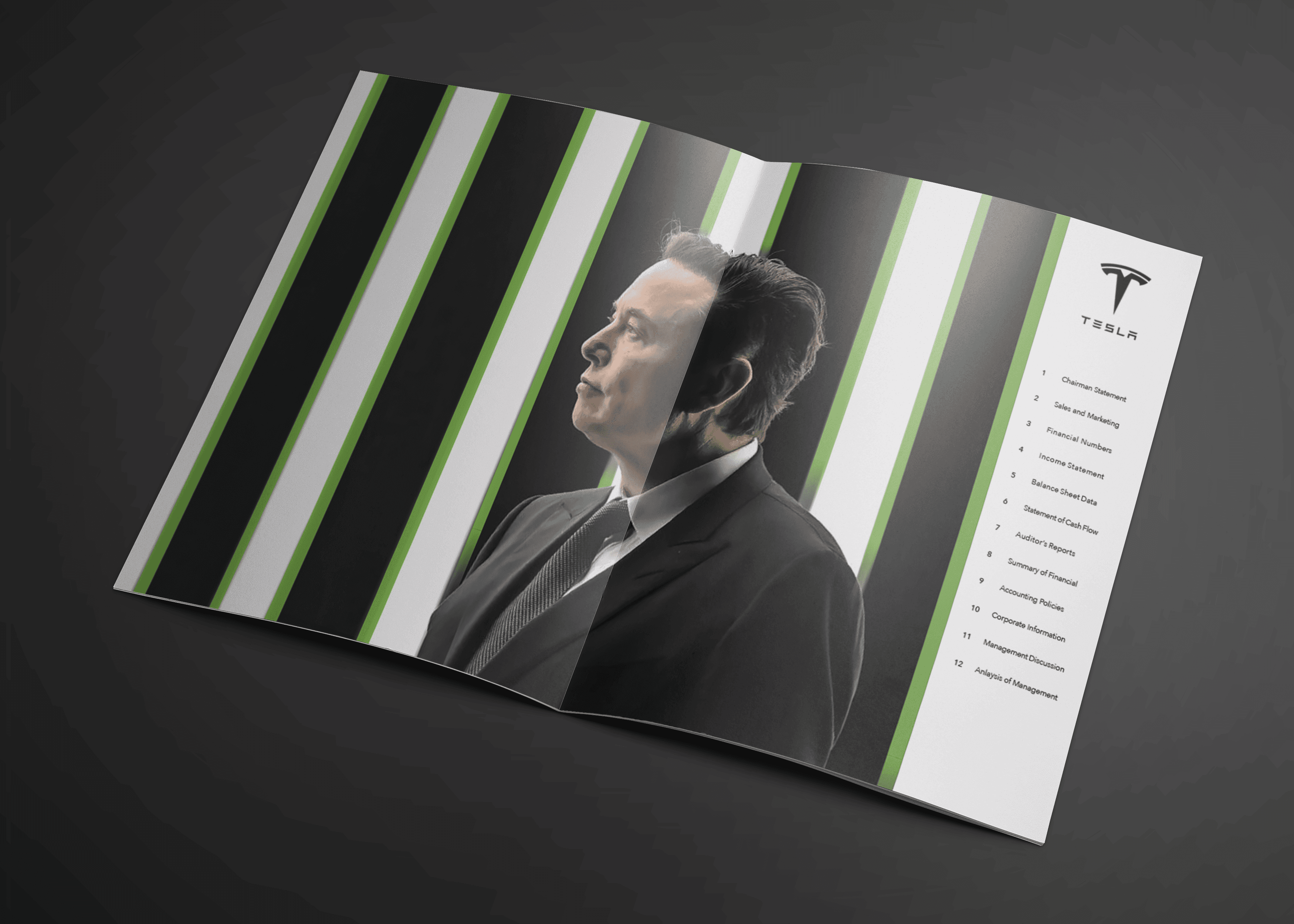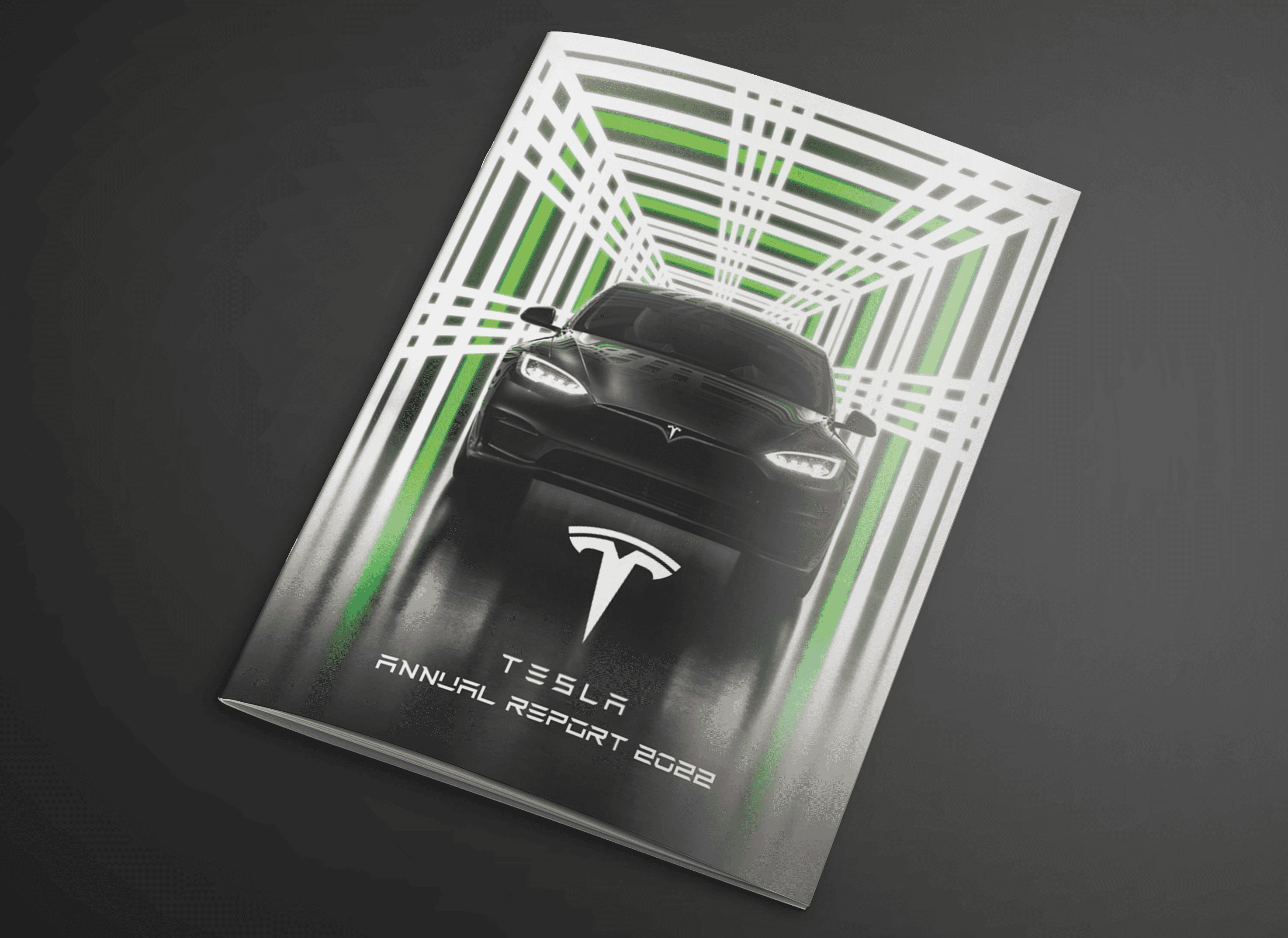 Concept design for a Tesla 2022 Annual Report, exploring how editorial layout and data visualization can transform complex financial information into a clear and engaging reading experience. The project includes a cover design and multiple interior spreads that organize large amounts of corporate text, financial figures, and performance data into structured layouts and graph-driven visuals. Emphasis was placed on maintaining clarity, hierarchy, and readability while presenting information typically found in investor-facing reports. The visual direction draws inspiration from Tesla’s futuristic and technology-driven brand, combining bold imagery, high-contrast lighting, and modern typography to reflect the company’s innovative identity. Project focus: editorial design, information hierarchy, and financial data visualization.