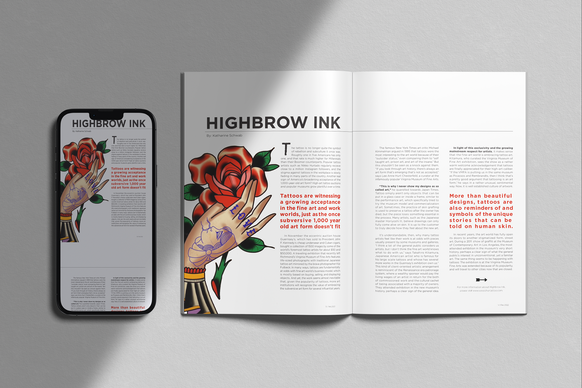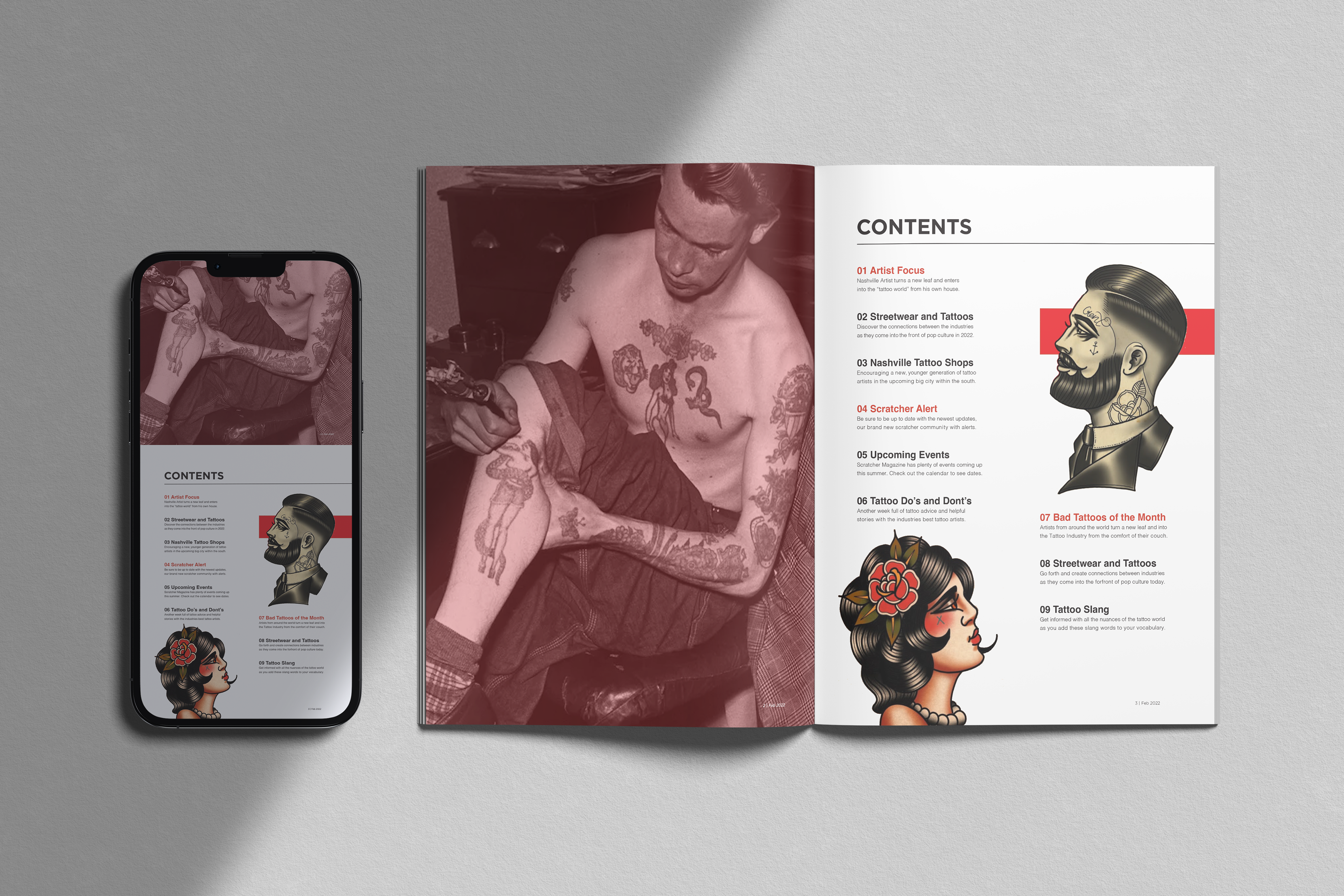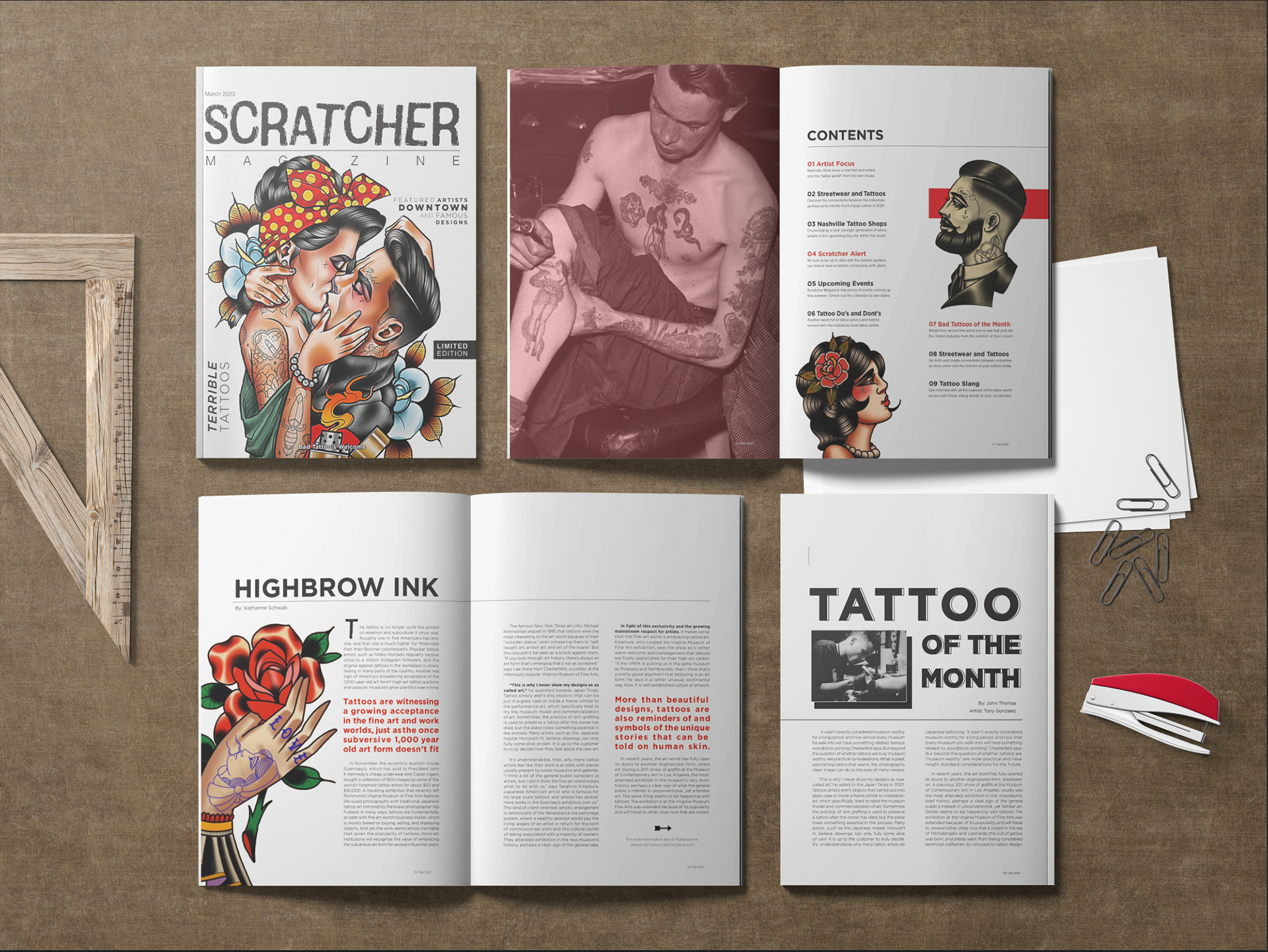 Magazine Concept titled "Scratcher," defined as 'an inexperienced and unclean artists that have taught themselves how to tattoo rather than being trained through an apprenticeship with a professional tattoo artist.' The magazine is supposed to not only highlight pieces, but show articles with tattoo tips, bad artwork, and stand-out 'scratcher' artists with the intention of going against industry standards. The project includes masthead, cover page, and spreads with mobile application.